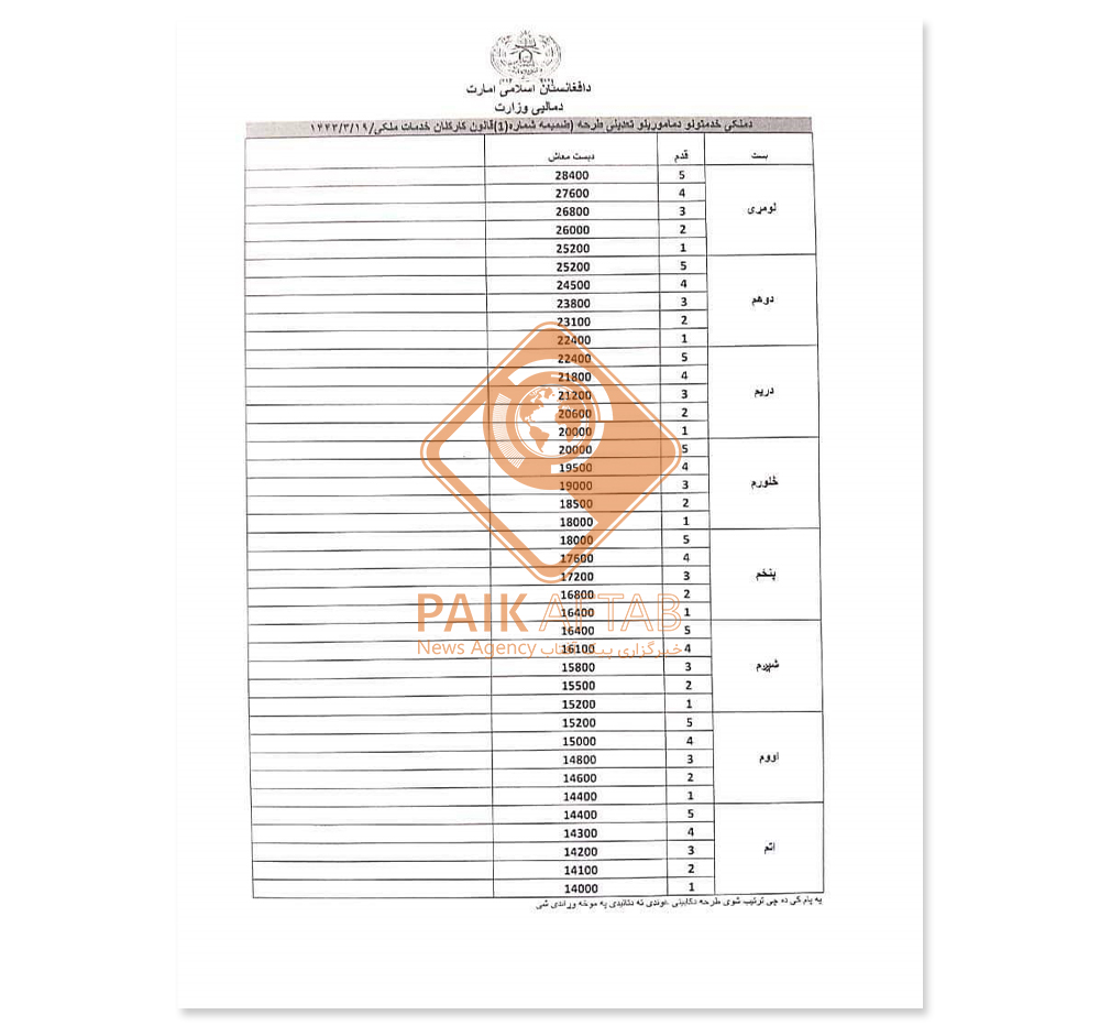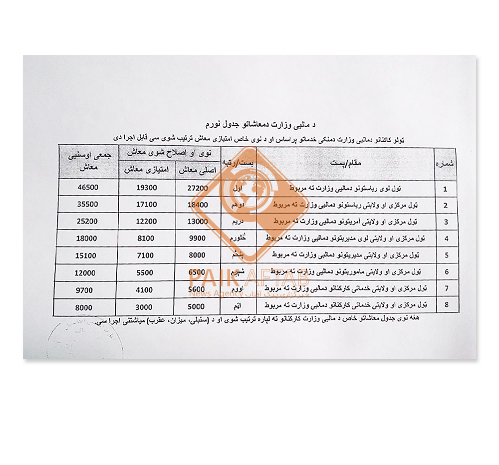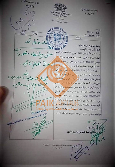 پیکآفتاب: یک منبع در وزارت مالیه با ارسال اسنادی به خبرگزاری پیکآفتاب گفته که به اساس هدایت مقامات ارشد وزارت مالیه، قرار است معاشات کارمندان این وزارت از کد 21 اجرا شود. منبع میگوید که مولوی هدایتالله بدری، سرپرست وزارت مالیه مبلغ 550 میلیون افغانی را بابت پرداخت حقوق دو ماهه کارمندان این وزارت در کابل و ولایت تخصیص داده است.