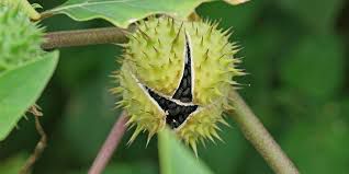 میوههای خاردار و بیضیشکل که درون آنها دانههای سیاه و سمی قرار دارد
