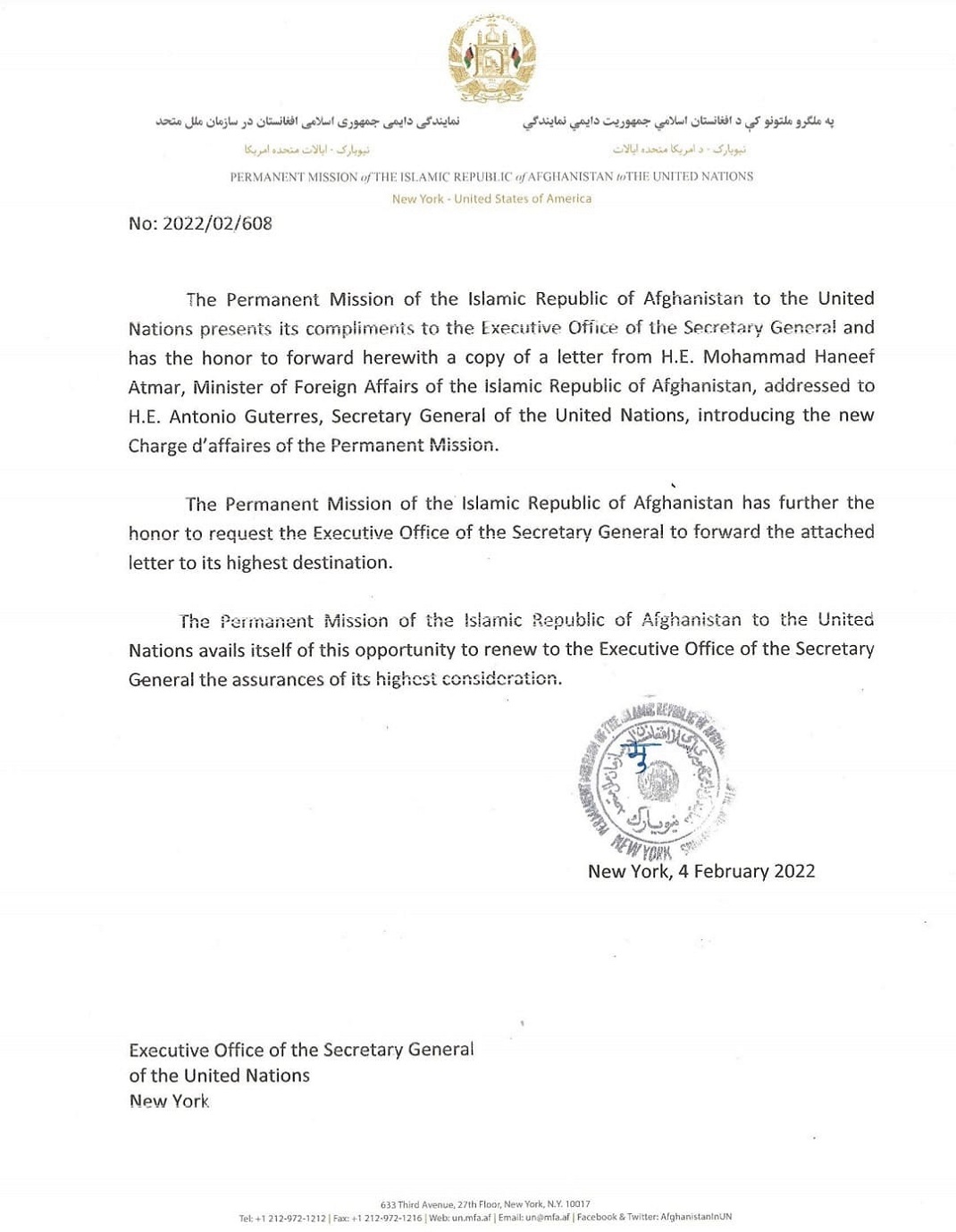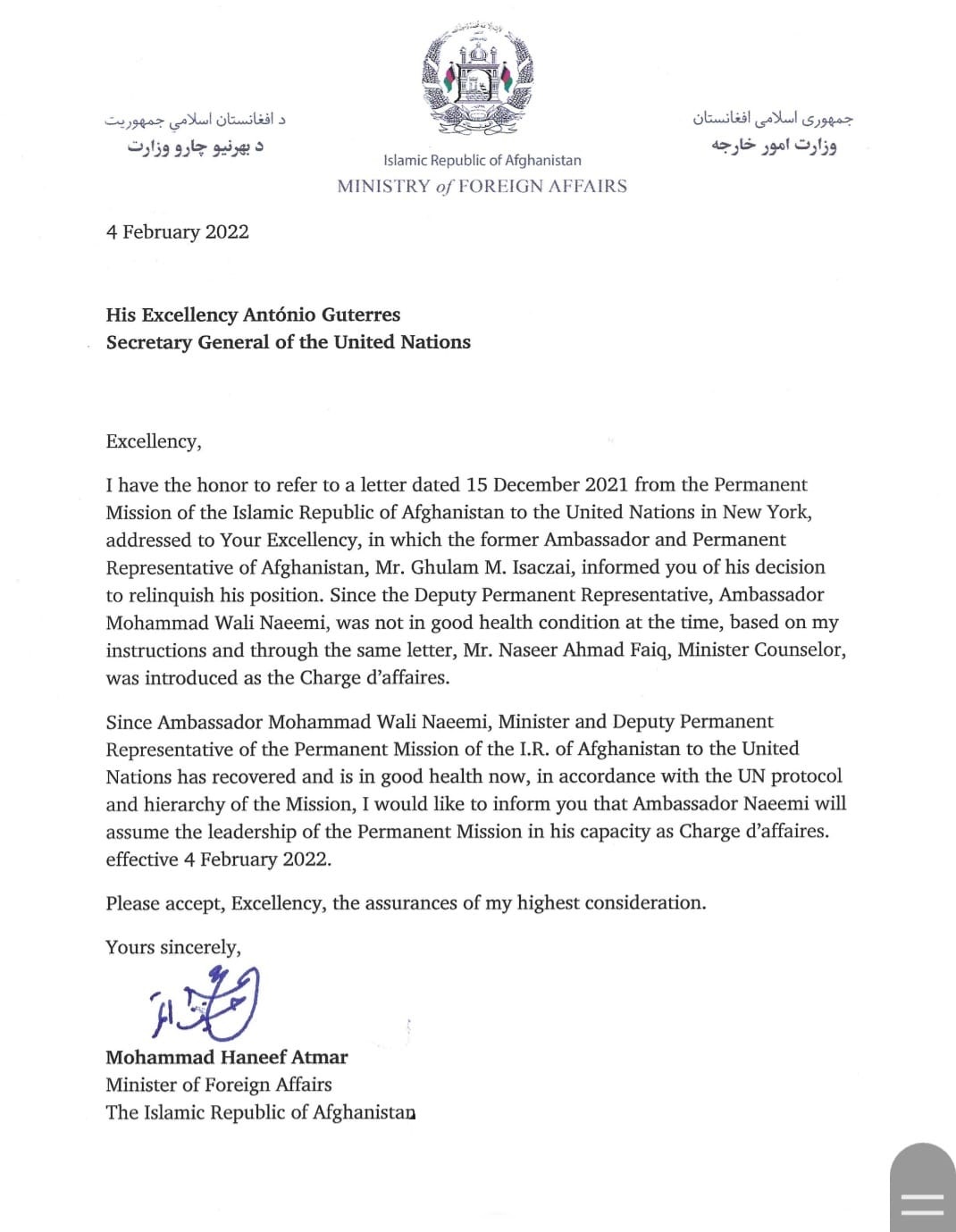 در نامه حنیف اتمر به آنتونیو گوترش آمده است: “از آنجایی که معاون نماینده دایمی، محمدولی نعیمی در آن زمان در وضعیت صحی خوب قرار نداشت، آقای نصیراحمد فائق، مشاور وزیر خارجه به عنوان کاردار معرفی شد. اکنون محمدولی نعیمی، معاون نمایندگی دائم جمهوری اسلامی افغانستان در سازمان ملل بهبود یافته، مطابق پروتکل سازمان ملل و سلسله مراتب ماموریت، به اطلاع شما میرسانم که سفیر نعیمی، مسئول رهبری ماموریت دایمی را بر عهده خواهد گرفت.”