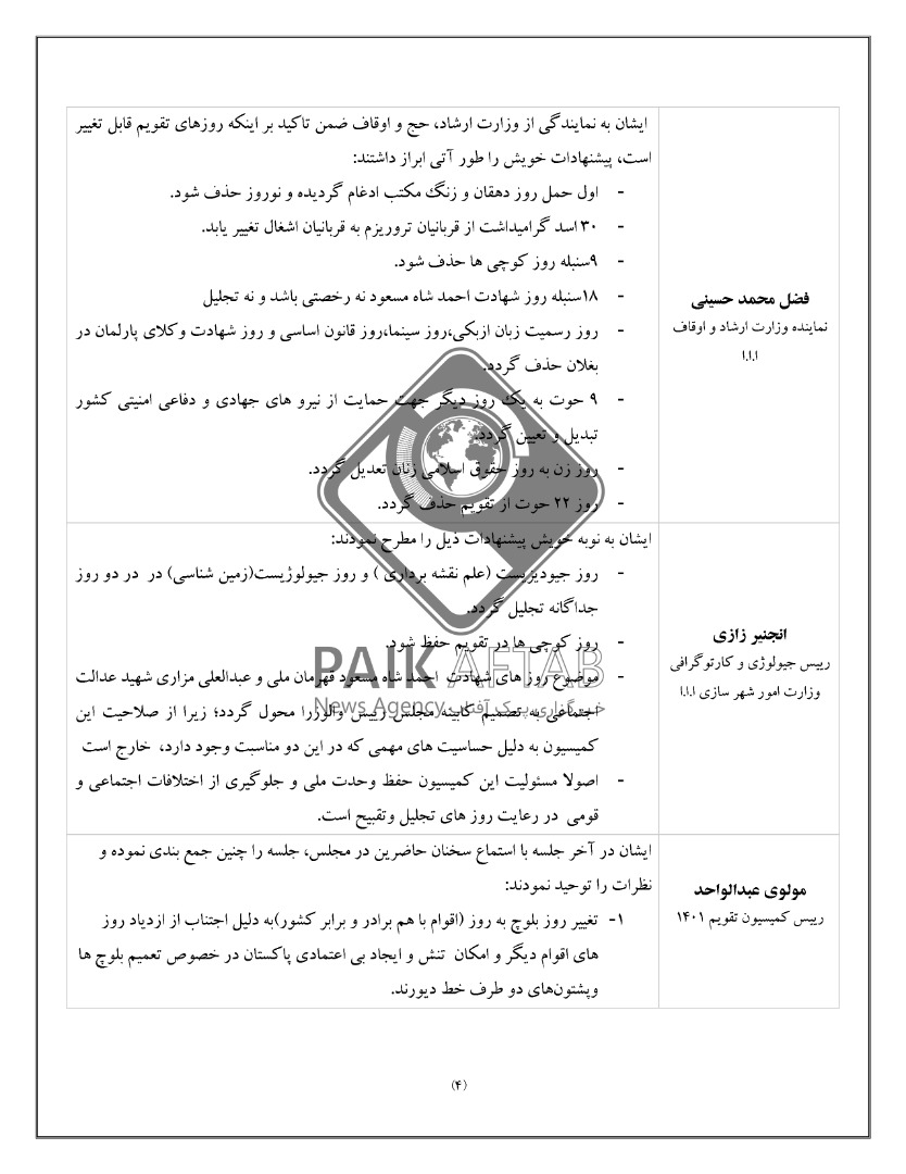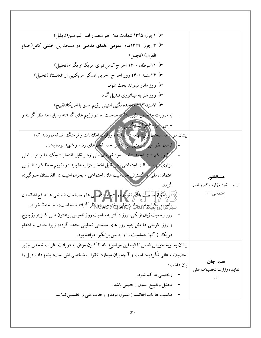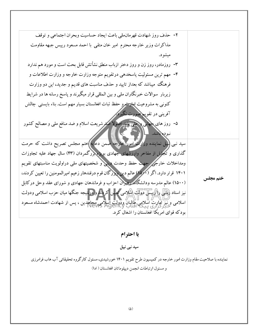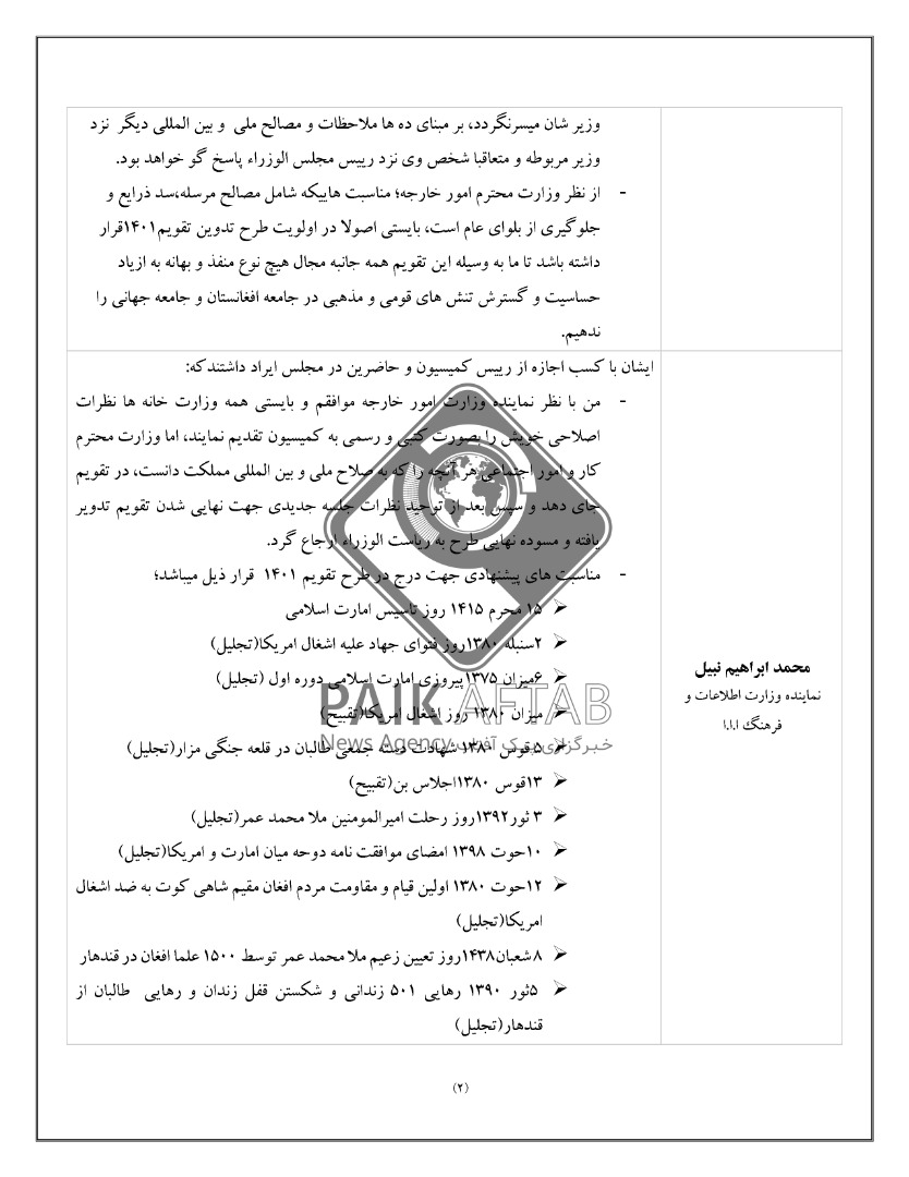 به اساس متن این سند، تدوین کنندگان خواهان حذف مناسبتهایی شده که به باور آنان ضد دین هستند. از جمله مناسبتهای پیشنهادی، حذف «نوروز» از طرح تقویم تدوین شده از سوی طالبان میباشد. حذف 22 حوت سالروز کشته شدن عبدالعلی مزاری که برخی از تدوین کنندگان طرح به آن تصریح کرده و برخی نیز آنرا مسکوت گذاشتهاند. البته برخی از تدوین کنندگان این کمیسیون گفتهاند که سالگرد احمدشاه مسعود و عبدالعلی مزاری، تنها به این دلیل که به حساسیتهای قومی دامن زده نشود، در تقویم حفظ گردند. آنان در عین حال، تاکید کردهاند که در این روزها اجازه برپایی هیچ مراسم و تجلیلی نباید داده شود.