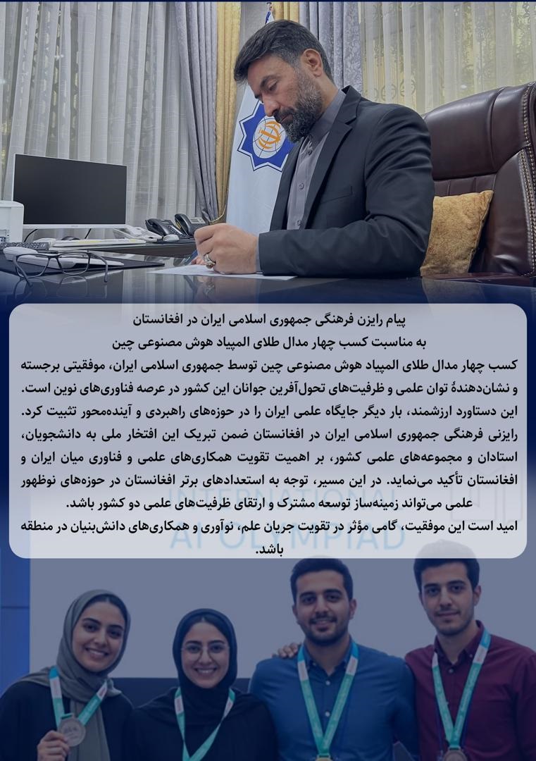 اخبار افغانستان تویت و تحلیل تیتر یک ورزش پیام تبریک رایزن فرهنگی ایران در کابل پس از درخشش دانشجویان ایرانی در المپیاد جهانی هوش مصنوعی چین by پیکآفتاب 9 قوس 1404 گزارش